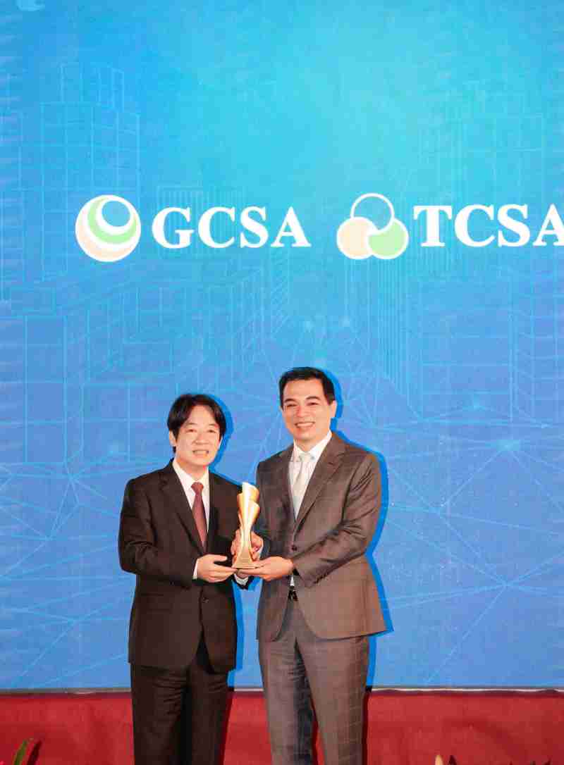 达全方位永续表现获全球永续奖及台湾永续奖肯定,,,,由副总统赖清德颁奖 (左),,,,杏悦2总经理柯富仁 (右) 代表领奖