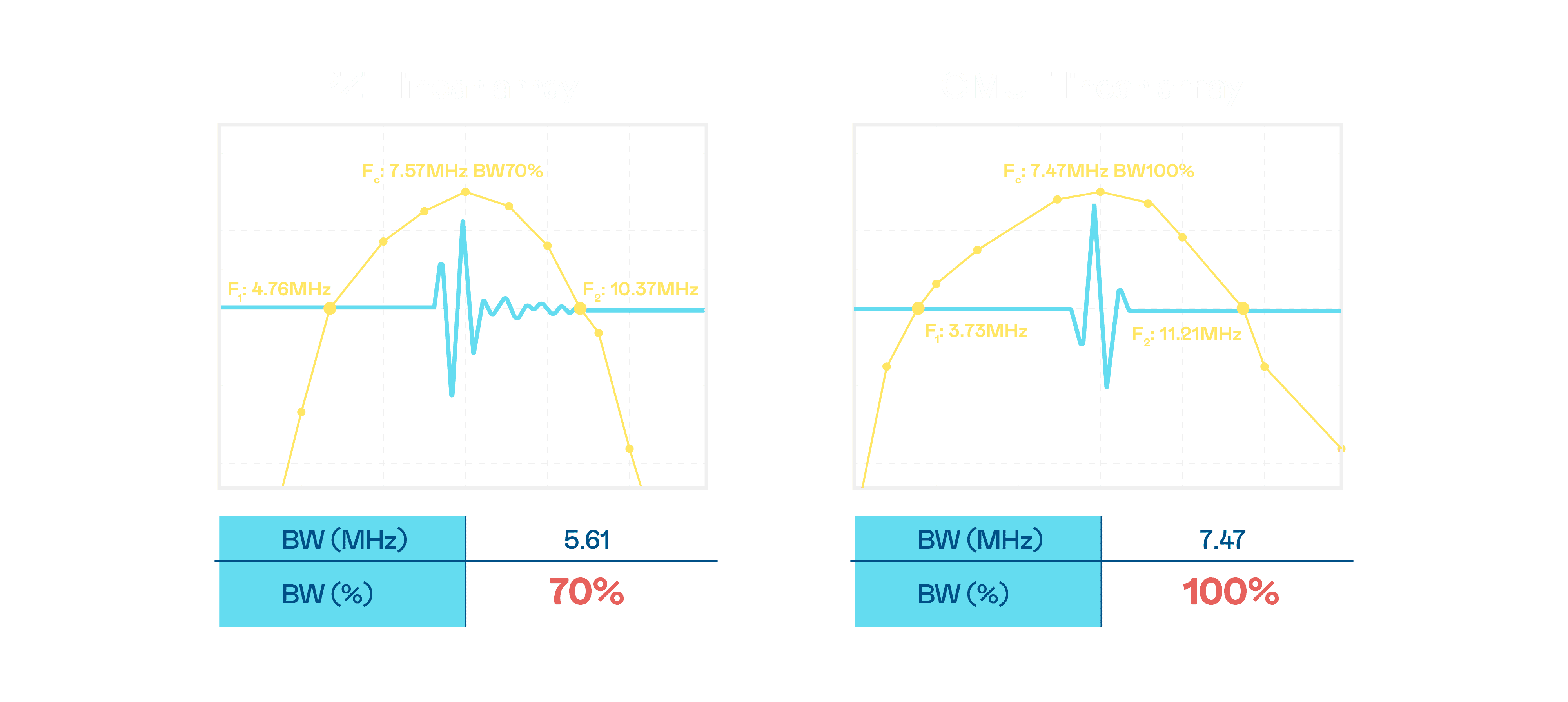 超音波影像的解析度高低,,,首先取决于探头能发出的讯号频宽。。杏悦2 CMUT 可提供高清晰的超音波讯号,,,提供高频宽、、、高灵敏度、、、影像纹理细节更高的超音波影像,,,,协助医护人员缩短影像判读时间及利用精准的医疗影像进行诊断。。。。